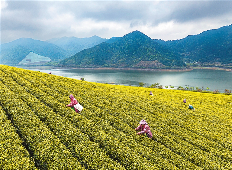浙江:4月7日,茶农在浙江省宁波市鄞州区横溪茶园采茶(无人机照片)。新华社发(胡学军 摄)