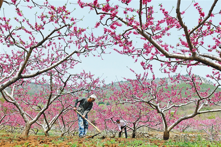 山东:4月8日,山东省枣庄市孟庄镇杜庄村果农在桃树下劳作。新华社发(孙中喆 摄)