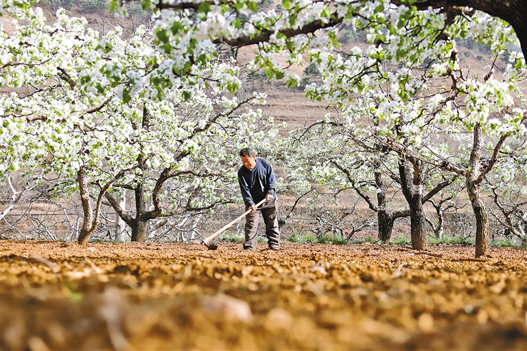 河北:4月8日,河北省遵化市铁厂镇农民在梨树果园松土整地。新华社发(刘满仓 摄)