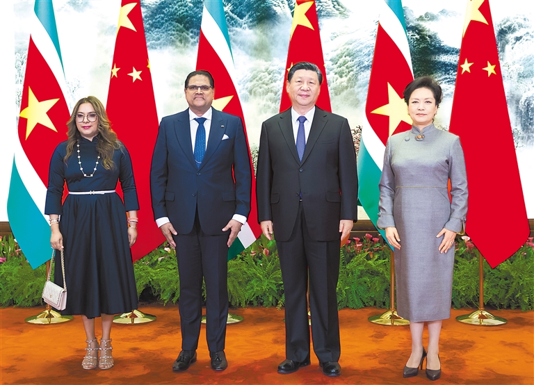 习近平强调,中方高度赞赏苏方始终坚定对华友好,在涉及中国核心利益和重大关切问题上坚定支持中方。中方也坚定支持苏方维护国家主权独立、自主选择符合本国国情的发展道路。中方愿同苏方继续相互理解、相互支持,保持高层交往,密切各部门、立法机构、政党间友好交往,加强治国理政经验交流。中方欢迎更多苏里南优质特色产品进入中国市场,愿同苏方深化共建“一带一路”合作,加强发展战略对接,拓展贸易、投资、农业、能源、矿业、基础设施建设、数字经济等领域合作,给两国人民带来更多实实在在的福祉。苏里南是加勒比地区华侨华人最多的国家之一,也是西半球首个把中国春节作为法定假日的国家。双方要继续鼓励人文交流,便利人员往来,共同建设好孔子学院。加强地方合作,不断丰富两国交流合作内涵。中方愿同苏里南等发展中国家一道,加强多边协调和团结合作,维护共同利益,实现共同发展,推动构建人类命运共同体。中方重视发展同加勒比国家关系,支持加勒比国家谋求繁荣发展、增进民众福祉,愿继续为地区国家经济社会发展提供力所能及的帮助。