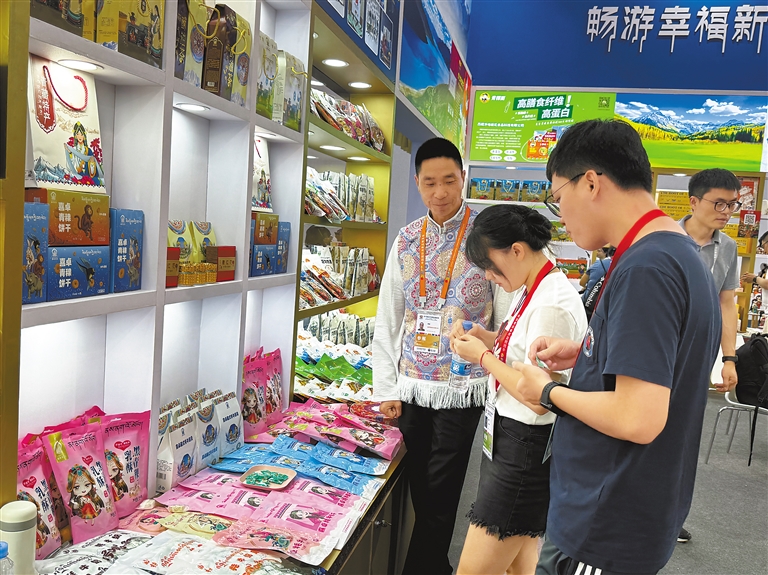 走进展馆内,琳琅满目、色彩鲜艳的雪域高原特色产品整齐摆放在展馆架上,吸引了众多客商和顾客前来咨询。