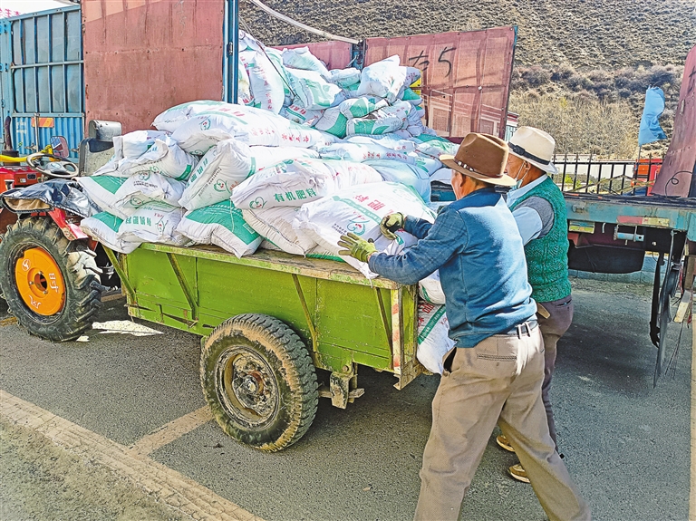 近日,拉萨市曲水县达嘎镇色甫村“两委”和驻村工作队举行免费发放有机肥料活动。图为村民领取政府发放的有机肥料。本报记者 格桑伦珠 摄