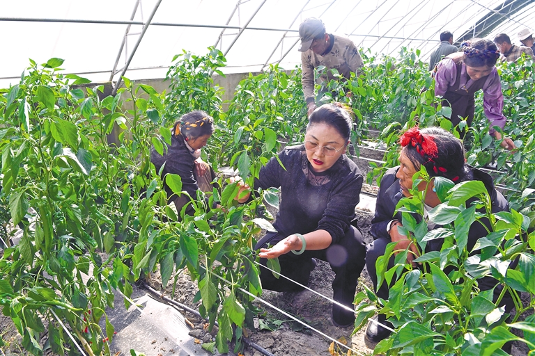 图为自治区农科院蔬菜研究所专家刘玉红(中)向拉孜镇蔬菜种植户开展技术指导。