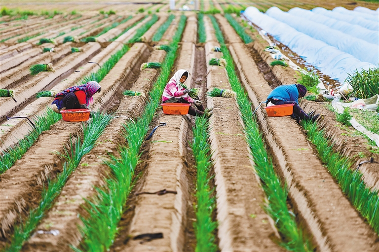 4月14日,在山东省青州市后坡村,农民在田间栽植葱苗。 新华社发(王继林 摄)