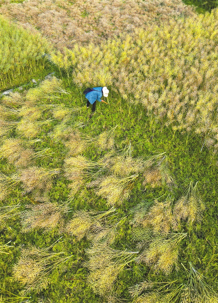 4月14日,贵州省从江县贯洞镇宰门村村民在田间收获油菜(无人机照片)。 新华社发(卢忠南 摄)