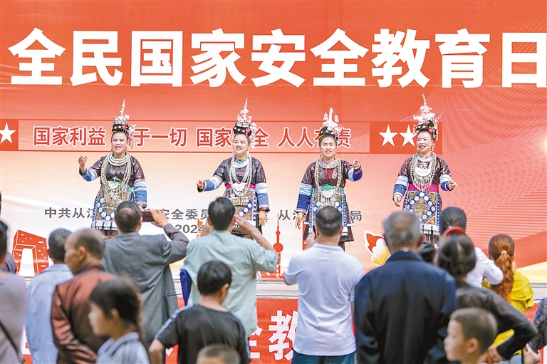在第九个全民国家安全教育日即将到来之际,各地开展形式多样的主题宣传教育活动,提高人们的国家安全意识。 图为4月14日,在贵州省黔东南苗族侗族自治州从江县古榕广场,侗族同胞用侗戏向群众宣传国家安全知识。 新华社发(吴德军 摄)