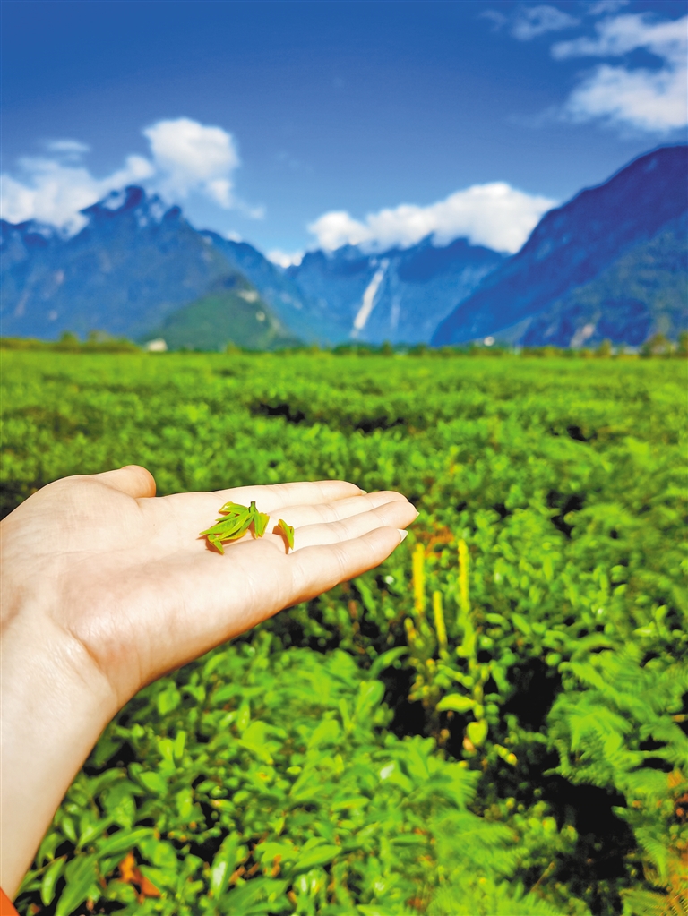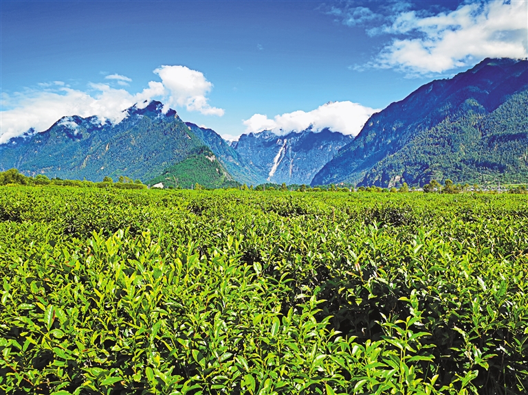 眼前,翠绿欲滴的千亩茶田连接碧色天空,连绵不绝的雪山耸入云雾,清水潺潺的声音环绕耳边,牛羊时不时抬头望向行人。易贡茶场平均海拔2200米,虽地处青藏高原,但来自印度洋的暖湿气流沿着雅鲁藏布大峡谷进入高原,为这片高原茶田带来丰沛的降水。“冬无严寒,夏无酷暑”,使茶树能够在这里茁壮成长。