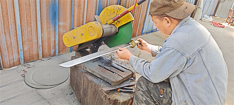 沿着民居错落的小路攀爬而上,来到江拉村易贡藏刀打制农牧民合作社,传承人西洛正在和线上购买者交流。宽敞的院坝和简易工作间里,木屑纷飞、火花四溅、铮铮有声,几十个村民正在藏刀制作“流水线”上忙碌,一路采访下来,我们也大致明白了易贡藏刀的制作流程: