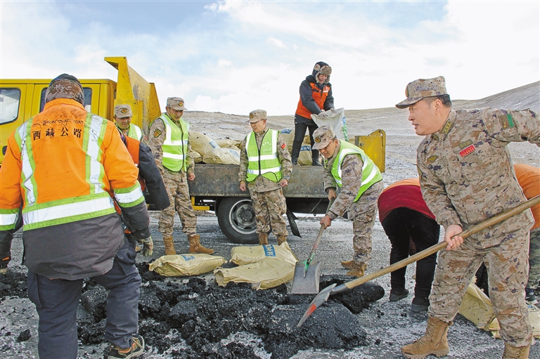 图为在唐古拉山顶,安多县人武部官兵和公路养护职工并肩护路,确保道路畅通无阻。