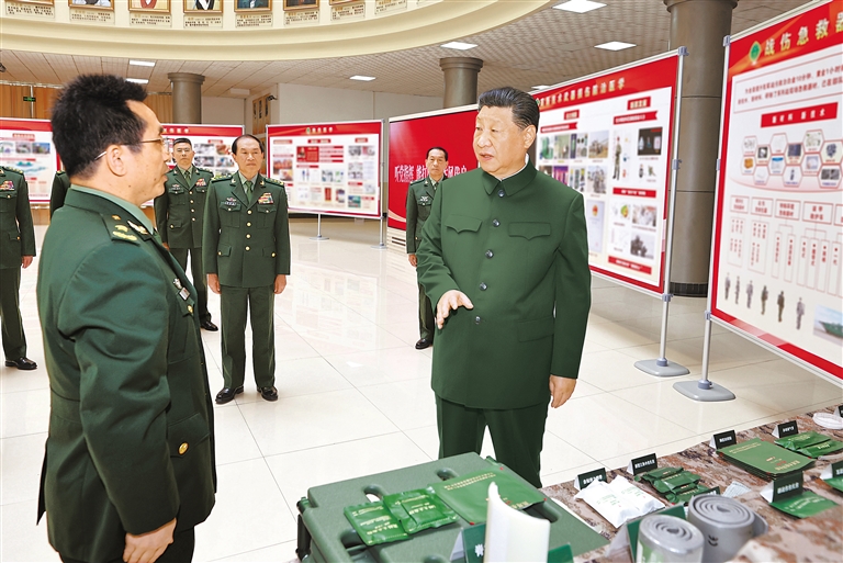 上午9时45分许,习近平来到陆军军医大学,首先了解大学基本情况和战场医疗救治重点学科情况,察看战伤急救器材和学员操作演示。陆军军医大学有着光荣历史传承,在长期办学实践中形成了高原军事医学、战创伤医学、烧伤医学等鲜明特色和优势。2017年调整组建以来,大学坚持姓军为战,推进创新发展,出色完成军事斗争卫勤保障、新冠疫情防控等一系列重大任务。习近平对陆军军医大学建设和完成任务情况给予肯定。