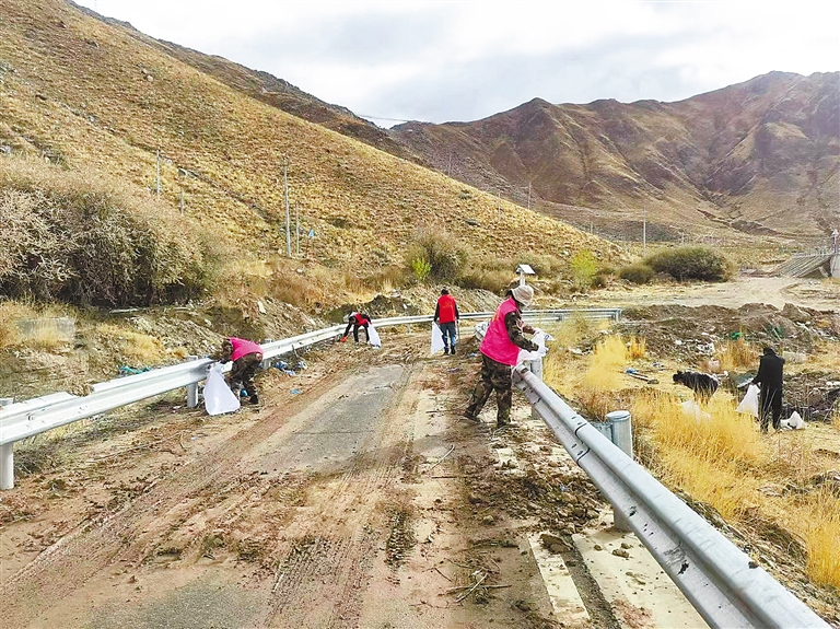 为弘扬奉献、友爱、互助、进步的志愿精神,营造更加文明、和谐的生活环境,提升居民的幸福感,近日,拉萨市城关区纳金街道组织各社区志愿者深入嘎巴村开展捡垃圾志愿服务活动。 图为志愿者对嘎巴村公路沿线和空地的白色垃圾、饮料瓶及塑料袋等进行清理。 本报记者 格桑伦珠 摄
