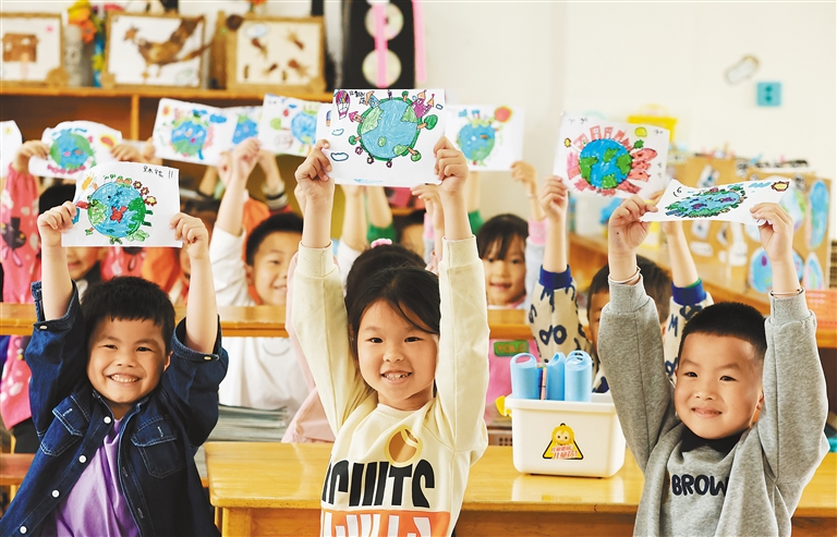世界地球日前,各地举办形式多样的主题活动,倡导人们爱护环境,共同守护家园。 图为4月19日,在浙江省湖州市德清县乾元镇东郊社区一幼儿园,孩子们展示他们创作的绘画作品《萌娃眼中的地球》。新华社发(倪立芳 摄)