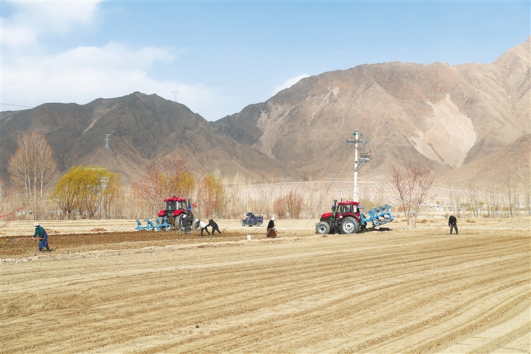 图①:扎囊县扎其乡孟卡荣村村民利用大型农机进行春耕春播。本报记者 李洲 摄
