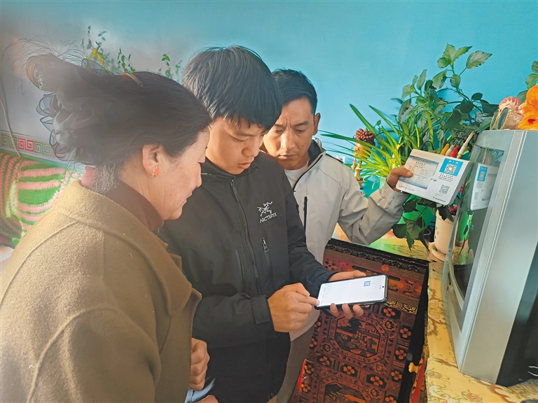 近年来,拉萨市曲水县广播电视台为解决“户户通”用户维修繁琐问题,推出广电公共服务便民维修信息系统“码上修”小程序。农牧民通过扫描机顶盒上的二维码即可报修,维修人员会及时上门维修,这样不仅提升了维修效率和质量,还受到了农牧民群众的广泛欢迎。 图为近日,工作人员深入群众家中贴二维码,并教他们如何使用“码上修”小程序。 本报记者 格桑伦珠 摄