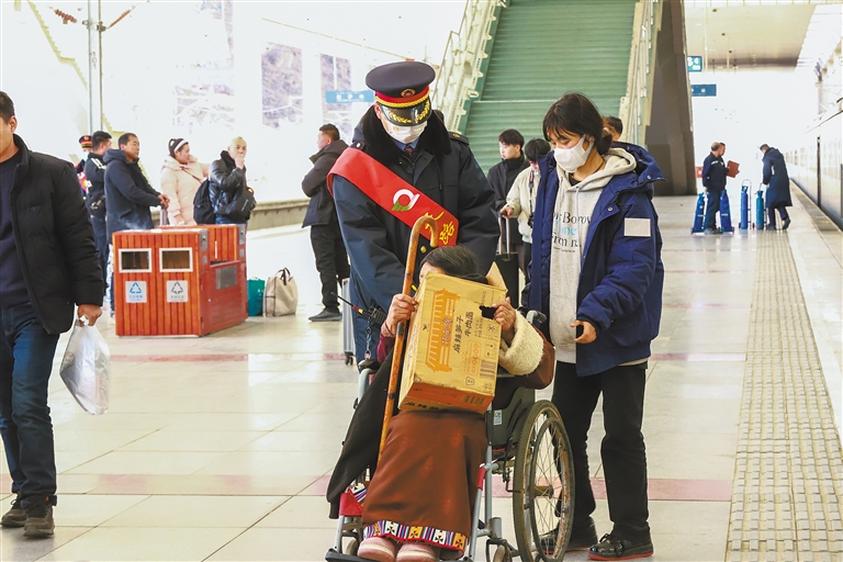 “五一”假期临近,拉萨火车站客流出现爆发式增长。今年的“五一”假期,铁路运输期限为4月27日至5月4日共计8天。中国铁路青藏集团有限公司拉萨车站根据假期客流变化,灵活调整列车开行方案,持续优化列车运行图,最大限度扩充运力运能,满足旅客假期出行需求。 图为拉萨车站“天路格桑花”青年志愿服务队工作人员为旅客服务。 孙皓 本报记者 丹增群培 摄