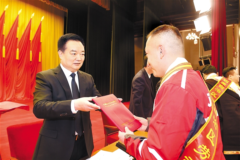 4月29日上午,2024年庆祝“五一”国际劳动节暨表彰西藏自治区劳动模范和先进工作者大会在拉萨举行。这是王君正向受表彰代表颁发证书和奖章。 本报记者 李洲 摄