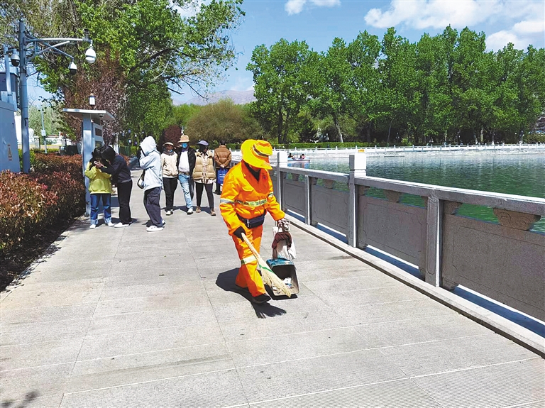 图③:5月1日,拉萨市宗角禄康公园内,清洁工人在清扫卫生。本报记者 蒋盖 摄