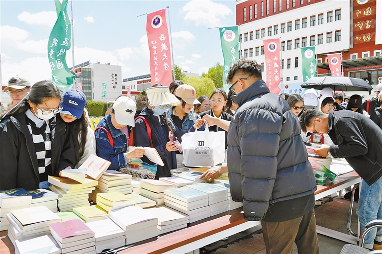 图为活动现场的图书展销摊位上,不少师生在选购书籍。本报记者 旦增兰泽 摄