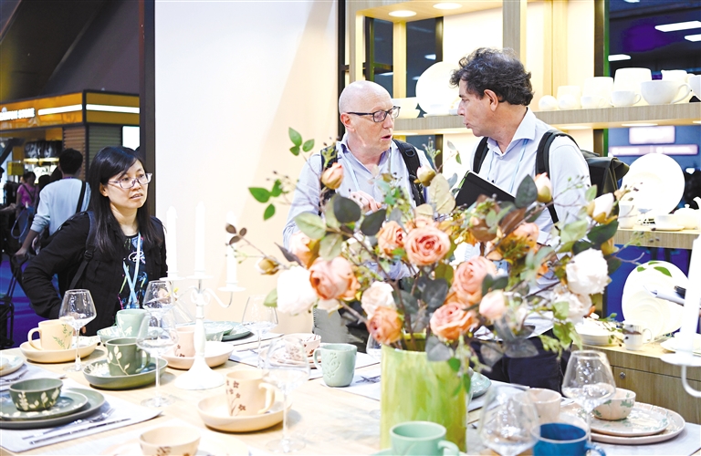 图为境外采购商在家用餐具展台前洽谈。 新华社记者 邓华 摄