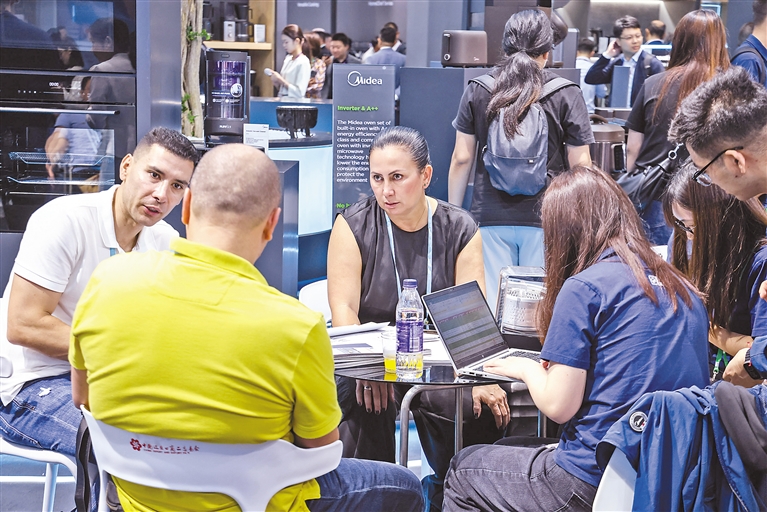 图为境外采购商在第135届广交会美的集团的展位洽谈(2024年4月15日摄)。 新华社记者 刘大伟 摄