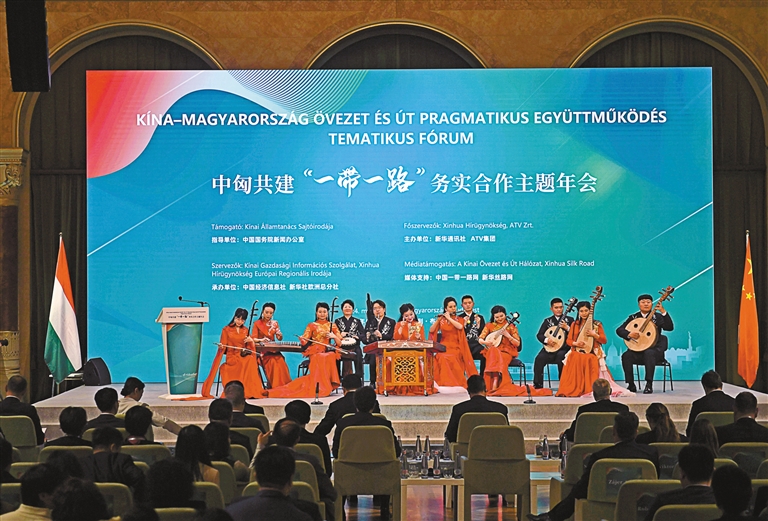 中匈共建“一带一路”务实合作主题年会2日在布达佩斯举行。中匈两国政府官员,商会和企业界代表以及两国主流媒体、智库负责人等约200人,围绕“引领中国-中东欧合作方向 共享发展机遇”的主题深入交流,达成多项务实合作成果,为中匈共建“一带一路”合作注入新的活力。 这是5月2日在匈牙利布达佩斯举行的中匈共建“一带一路”务实合作主题年会上拍摄的中国民乐表演。新华社记者 贺灿铃 摄