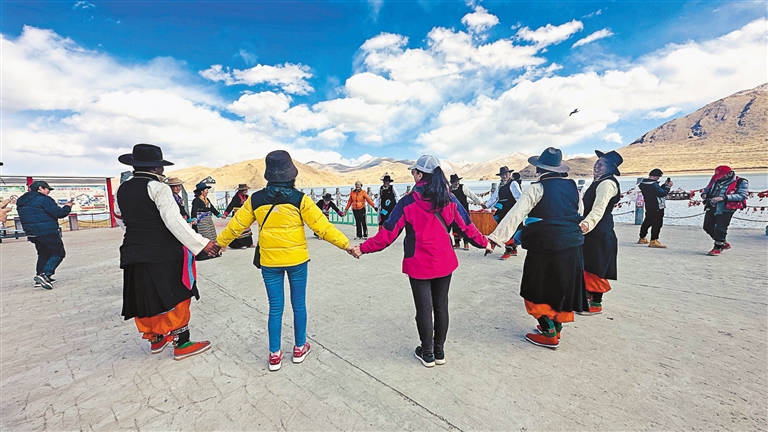 近日,浪卡子县白地乡行政村文艺演出队身穿传统服饰,跳着欢快的锅庄,邀请前来羊卓雍错旅游的游客参与其中。图为活动现场。本报记者 巴桑旺姆 摄