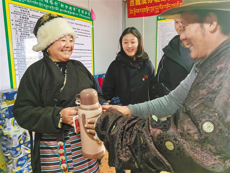 近年来,那曲市色尼区统筹推进基层党建示范点建设、树立农牧民新风貌试点、巾帼示范点和新时代文明实践等工作,推广运用“文明积分超市”,探索打造党建引领基层治理的样板,各村(居)结合积分细则,基于群众在持续深化乡村治理、参与村务议事、人居环境整治、村集体活动等重点工作中配合程度和完成力度给予积分,并按照“以奖代补、多劳多得”的奖励机制,为群众集中进行商品兑换,受到广大群众广泛欢迎。 图为那曲市色尼区那曲镇色尼雄塔村村民斯秋多杰(左一)用积分兑换商品。 本报记者 万靖 摄