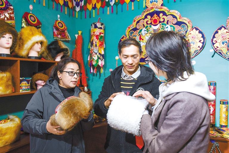 图为拉萨市尼木县吞普村二组曲果妇女缝纫农民专业合作社的工作人员向游客介绍产品。