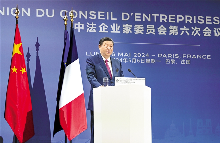 当地时间五月六日下午,国家主席习近平在巴黎同法国总统马克龙共同出席中法企业家委员会第六次会议闭幕式,并发表题为《继往开来,携手开创中法合作新时代》的重要致辞。 新华社记者 谢环驰 摄