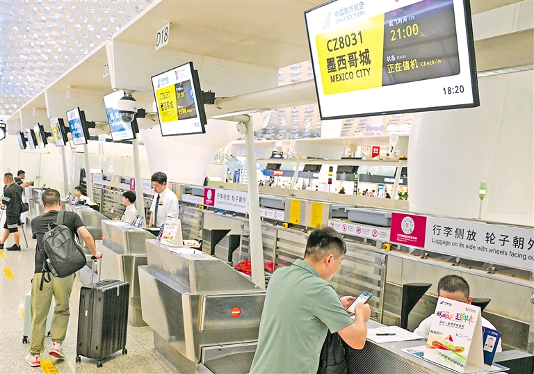 图为5月11日,在深圳宝安国际机场,搭乘深圳—墨西哥城直飞航线的乘客办理值机。