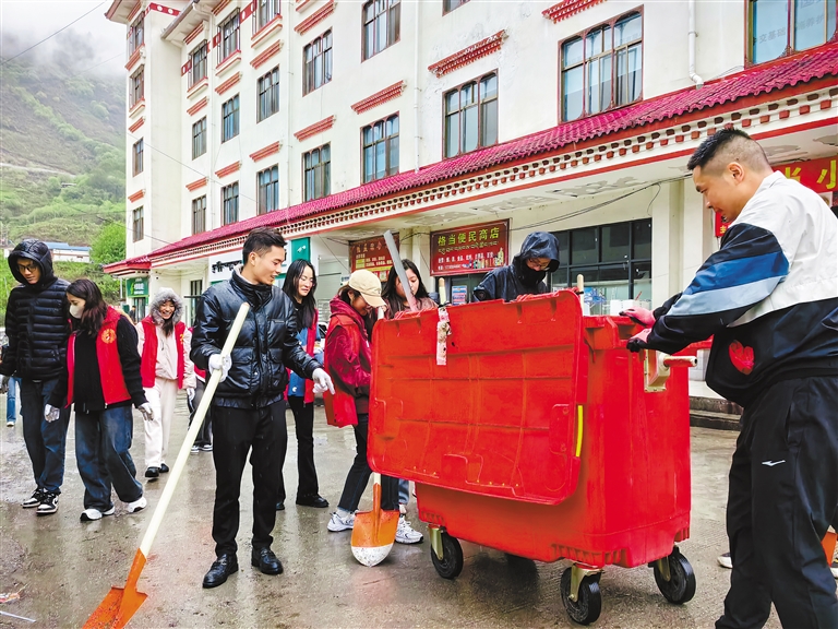 日前,林芝市墨脱县格当乡新时代文明实践所,组织全乡党员、团员组成“青年先锋队”,前往占根卡扶贫商住楼开展“我为群众办实事清洁除尘行动”。活动改善了居民居住环境,营造了共建共享美好家园的浓厚氛围。 图为志愿者们正在清理垃圾。 本报记者 王敏 本报通讯员 郎玲 摄