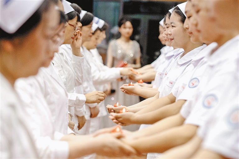 近日,各地举行丰富多彩的活动,迎接国际护士节。 图为5月10日,浙江省湖州中等卫生专业学校,护理前辈、专业教师将象征“燃烧自己,照亮他人”的蜡烛传给护理专业学生。 新华社发(谭云俸 摄)