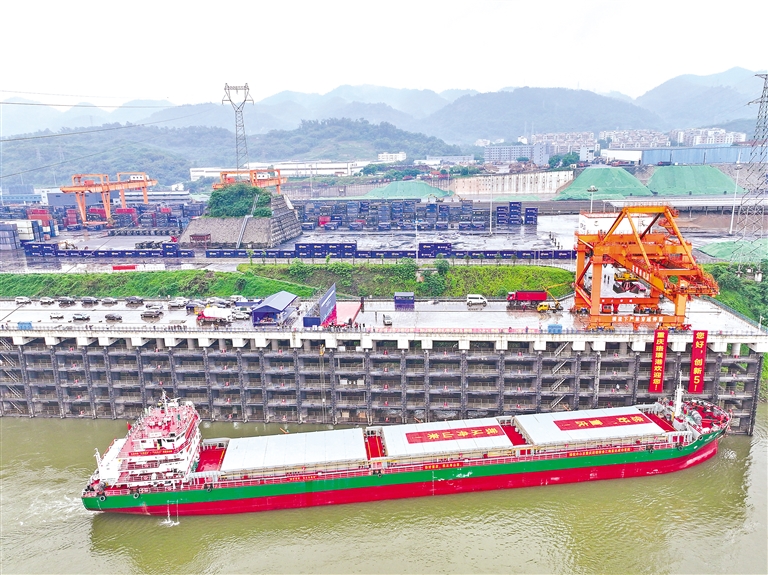 5月12日,舟山至重庆江海直达航线首航测试到港接航仪式在重庆市江津区珞璜港举行。万吨级江海直达船“创新5”轮4月24日自浙江舟山港启程,5月11日下午抵达重庆江津珞璜港,这也是万吨级江海直达船首次抵达长江上游地区。“舟山—重庆”江海直达航线是长江上游首条江海直达航线。