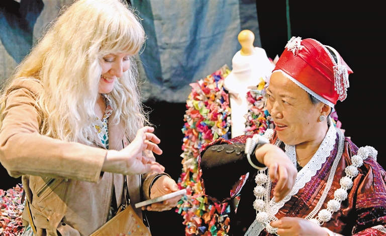 5月13日,在英国伦敦手工艺周“设计中国·和韵华夏”主题展上,英中贸易协会执行董事莉丝·贝特尔森(左)向中国手工艺人学习苗绣手法。