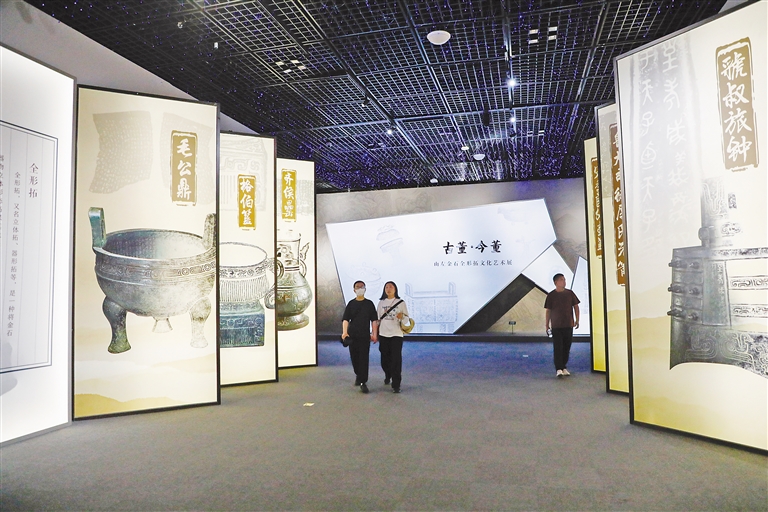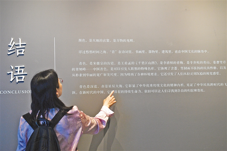 图为5月14日,在南京六朝博物馆内,观众观看“只此中国色·青”展览的结语。新华社发(王跃武 摄)