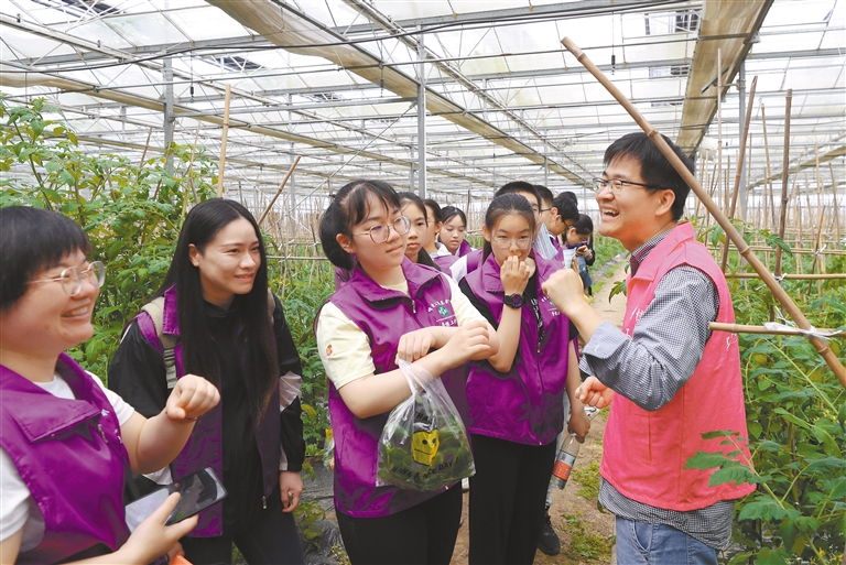 图为交大农学院的科研人员(右)在番茄选育种植大棚内为同学们讲解基因筛选的过程。新华社记者 方喆 摄