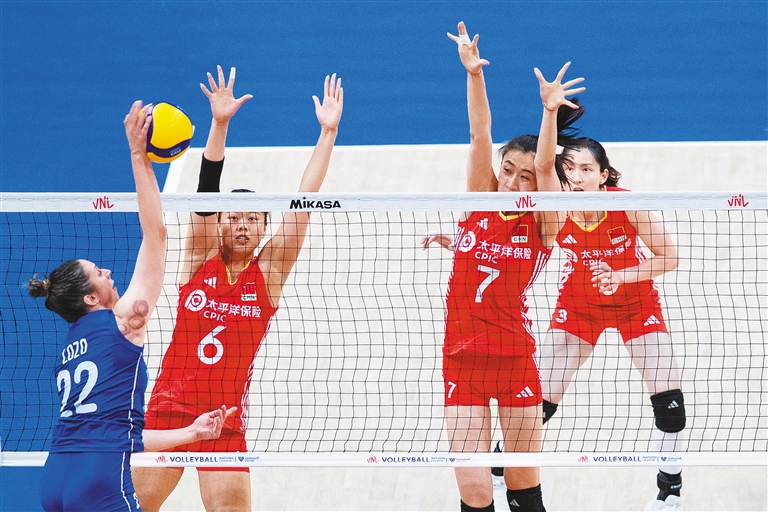 在2024世界女排联赛里约热内卢站比赛中,中国队3比1战胜塞尔维亚队。图为中国队球员龚翔宇(左二)、王媛媛(右二)在比赛中拦网。新华社记者 王天聪 摄
