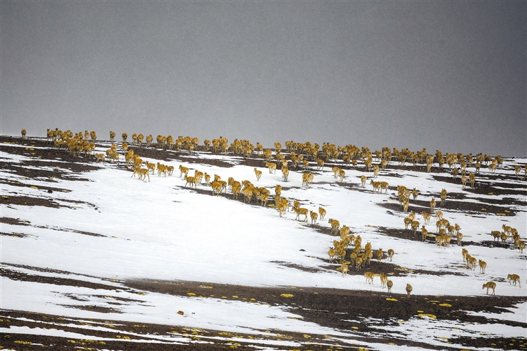 近日,在位于西藏自治区北部的羌塘国家级自然保护区,大群怀孕的雌性藏羚羊开始集结成群,向习惯产羔地迁徙。