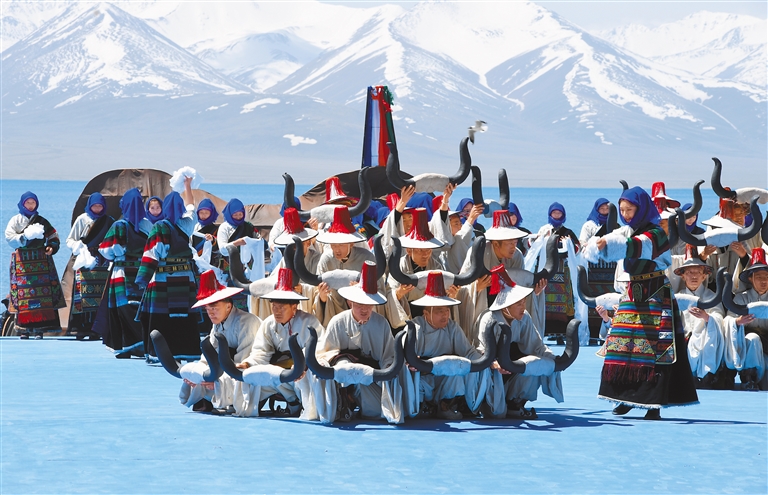 随着气温升高,西藏纳木措解冻开湖,迎接即将到来的旅游旺季。图为舞蹈演员在纳木措开湖活动现场表演。本报记者 旦增兰泽 摄