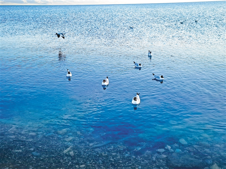 山与水相拥而生,文与旅相融而兴。5月18日傍晚,在纳木措,远远望去,蔚蓝辽阔的湖面与天际连成一线,清澈的湖水与远处的念青唐古拉山相互辉映、水天一色,湖水轻柔地拍打岸边砂石,一群棕头鸥在消逝的湖面上嬉戏玩闹,邀请游客共赏这绝美的视觉盛宴。