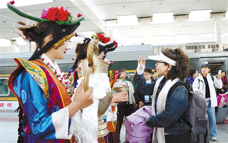 游客们走下列车,被眼前的一切深深吸引。他们有的拿出手机,记录下这难忘的瞬间,有的则沉浸在这欢乐的氛围中,感受着京藏两地的深厚情谊。