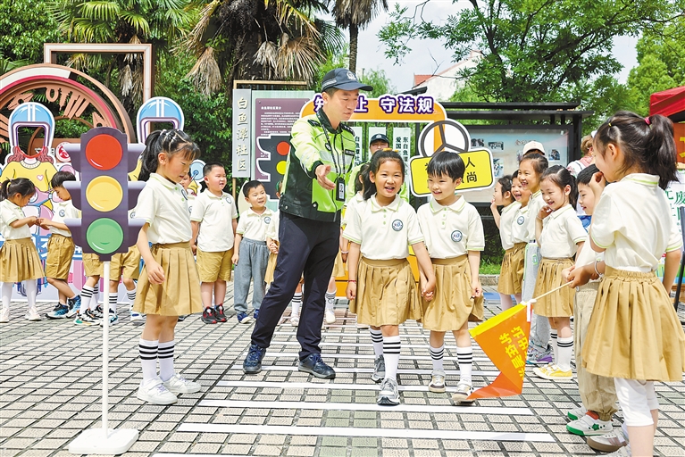 图为5月21日,在湖州市吴兴区龙泉街道白鱼潭社区的“有礼市集”上,交警通过场景模拟的方式为湖州市第三幼儿园的孩子们普及交通安全知识。新华社记者 徐昱 摄