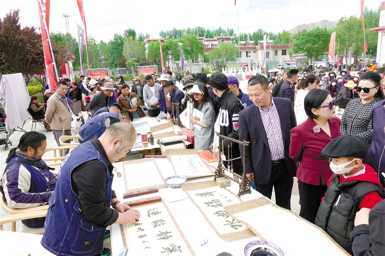 文艺进万家,健康你我他。5月23日,西藏文艺志愿者在拉萨市曲水县新时代文明实践中心开展志愿服务。活动现场,西藏哈呼曲艺社与曲水县艺术团为当地干部群众带来了一场别开生面的文艺演出。西藏书法家协会的书法家们当场挥毫泼墨,采用群众现场“点单”送书法的模式,创作了一幅幅书法作品。西藏摄影家协会的摄影家们架设器材、搭建摄影板,为大家拍摄出一张张满意的照片,并现场打印赠送证件照和合家欢照片,将幸福瞬间定格为永恒的记忆。