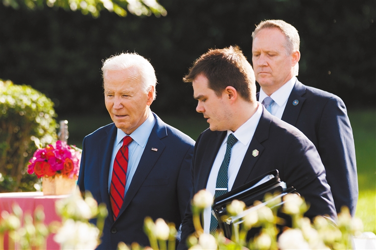 这是5月13日在美国华盛顿白宫拍摄的美国总统拜登(左一)。 新华社发 (亚伦 摄)