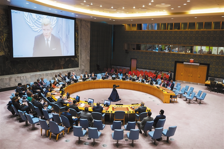 这是5月13日在位于纽约的联合国总部拍摄的安理会也门问题公开会现场。新华社发 (联合国供图/曼努埃尔·伊莱亚斯 摄)