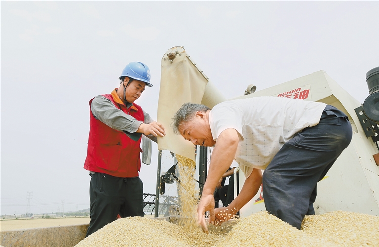 图为5月27日,在河南省汝阳县陶营村,汝阳县供电公司焦裕禄共产党员服务队队员帮助农民抢收小麦。新华社发
