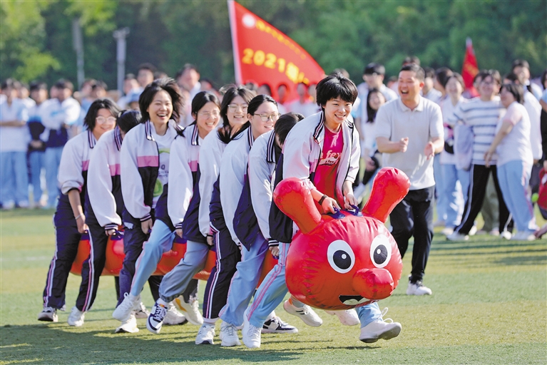 5月22日,学生在贵州省黔西第一中学操场参加趣味游戏。 新华社发(范晖 摄)