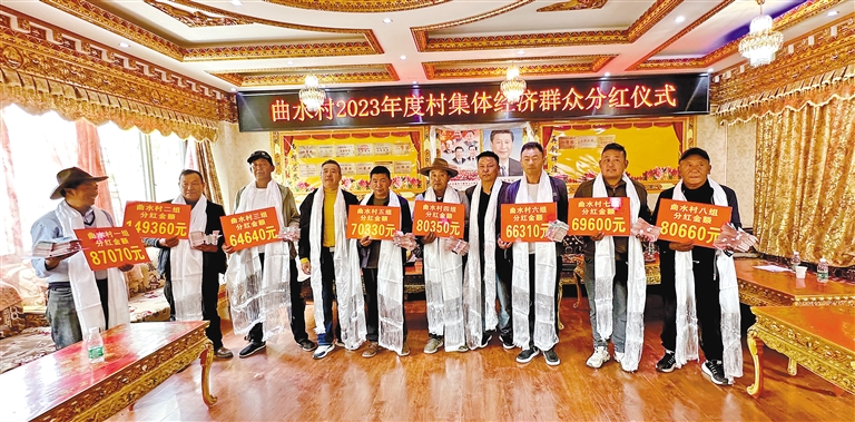 近日,拉萨市曲水县曲水镇曲水村举行村集体经济群众分红仪式,总计向 2334 名群众发放 668320 元。 图为分红仪式现场。 本报记者 格桑伦珠 摄