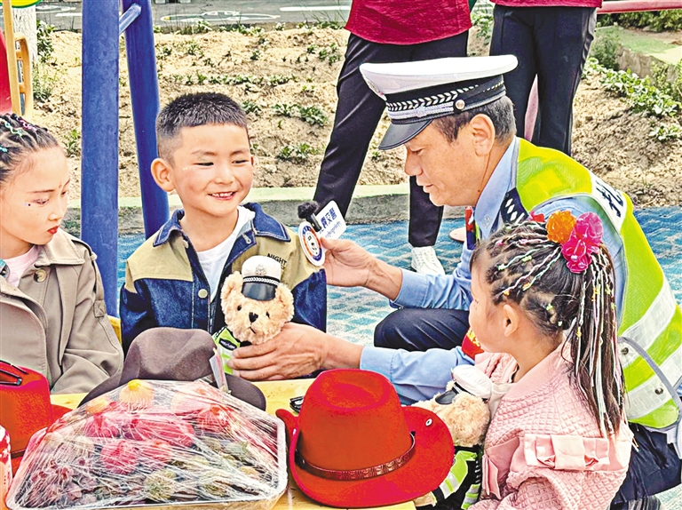 图为交警与孩子们在互动问答。 本报记者 武沛涛 本报通讯员 益西次旺 摄