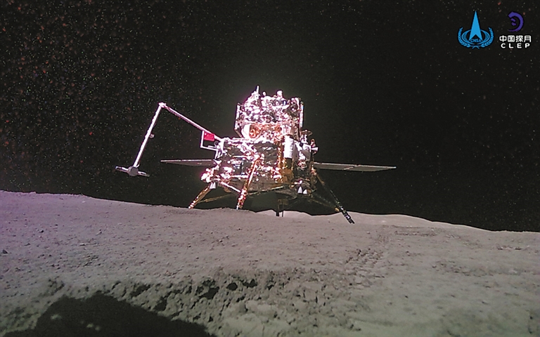 月背之旅,拍照“打卡”不能少。着陆后,嫦娥六号着陆器和上升器组合体携带的“摄影小车”,自主移动并成功拍摄回传着陆器和上升器合影。